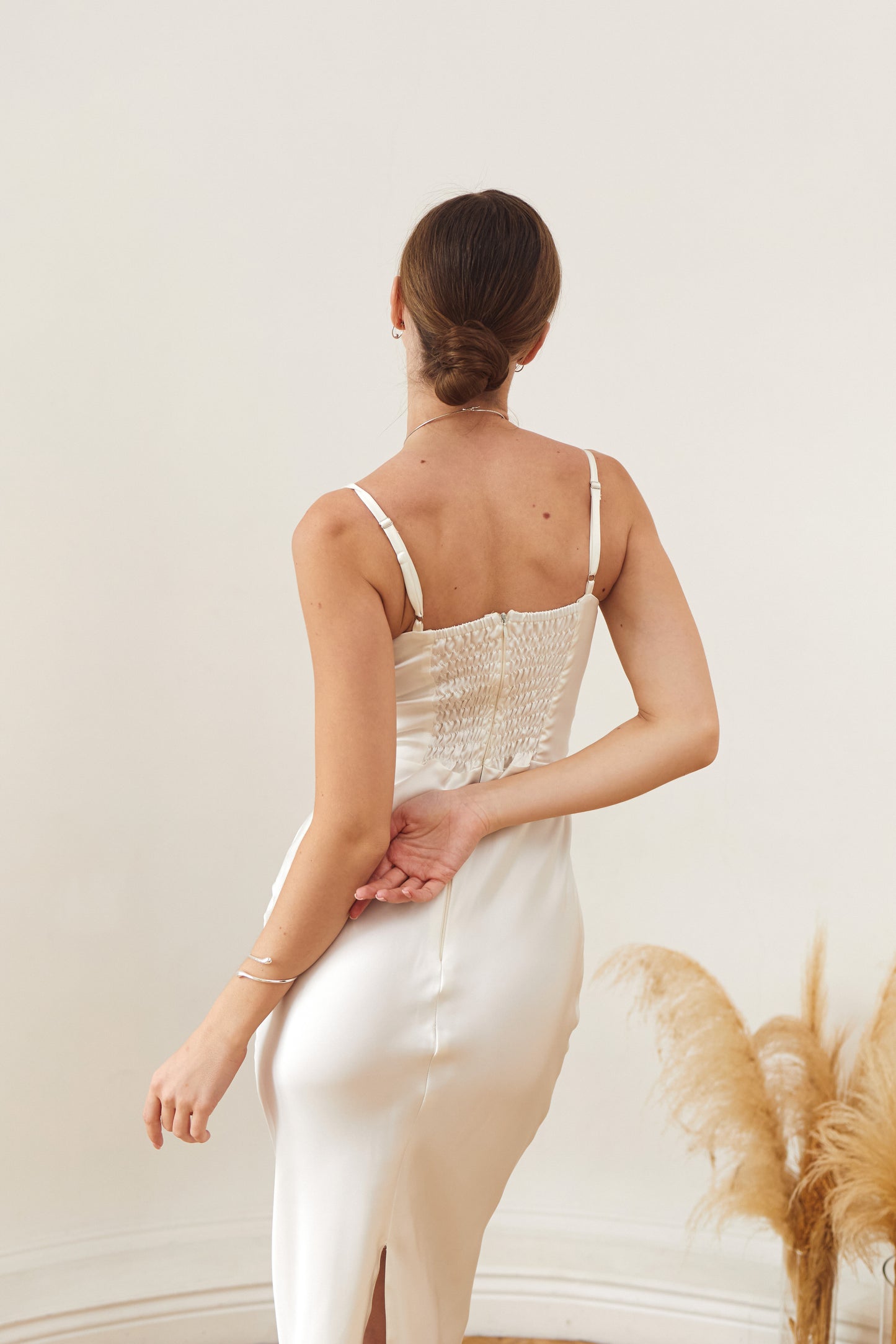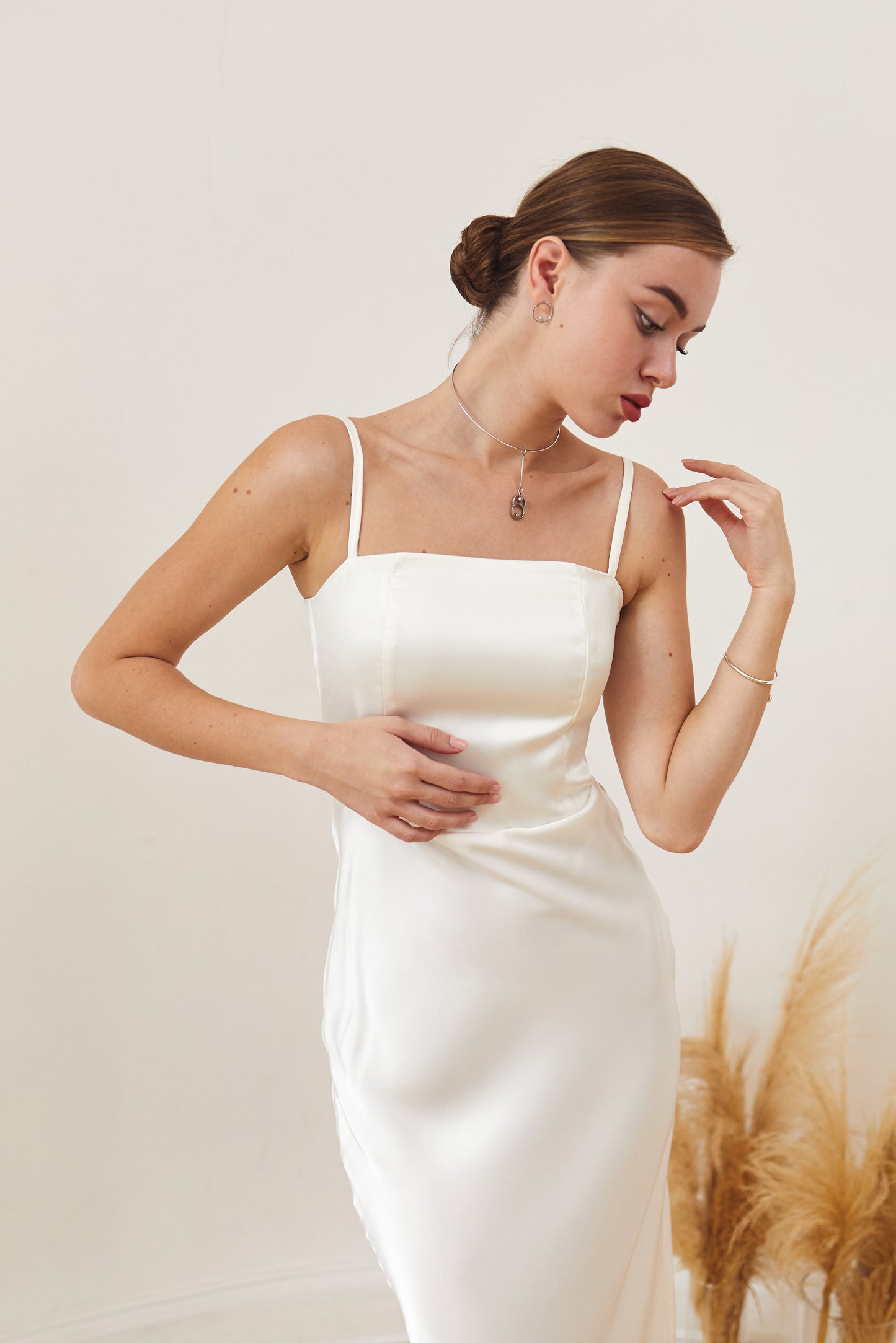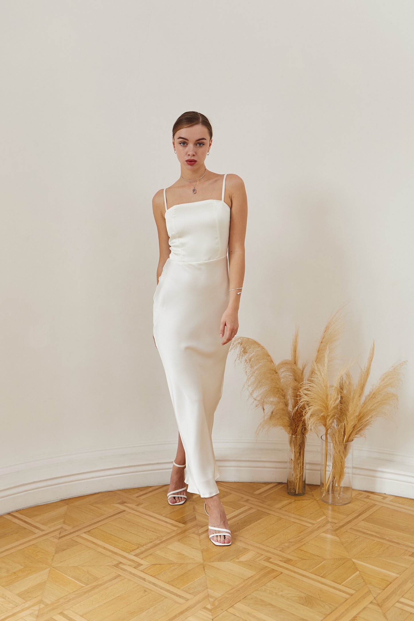 Choose ivory or pure white color spaghetti straps elegant dress for any bridal occasions - rehearsal dinner dress, reception dress or bridal shower dress