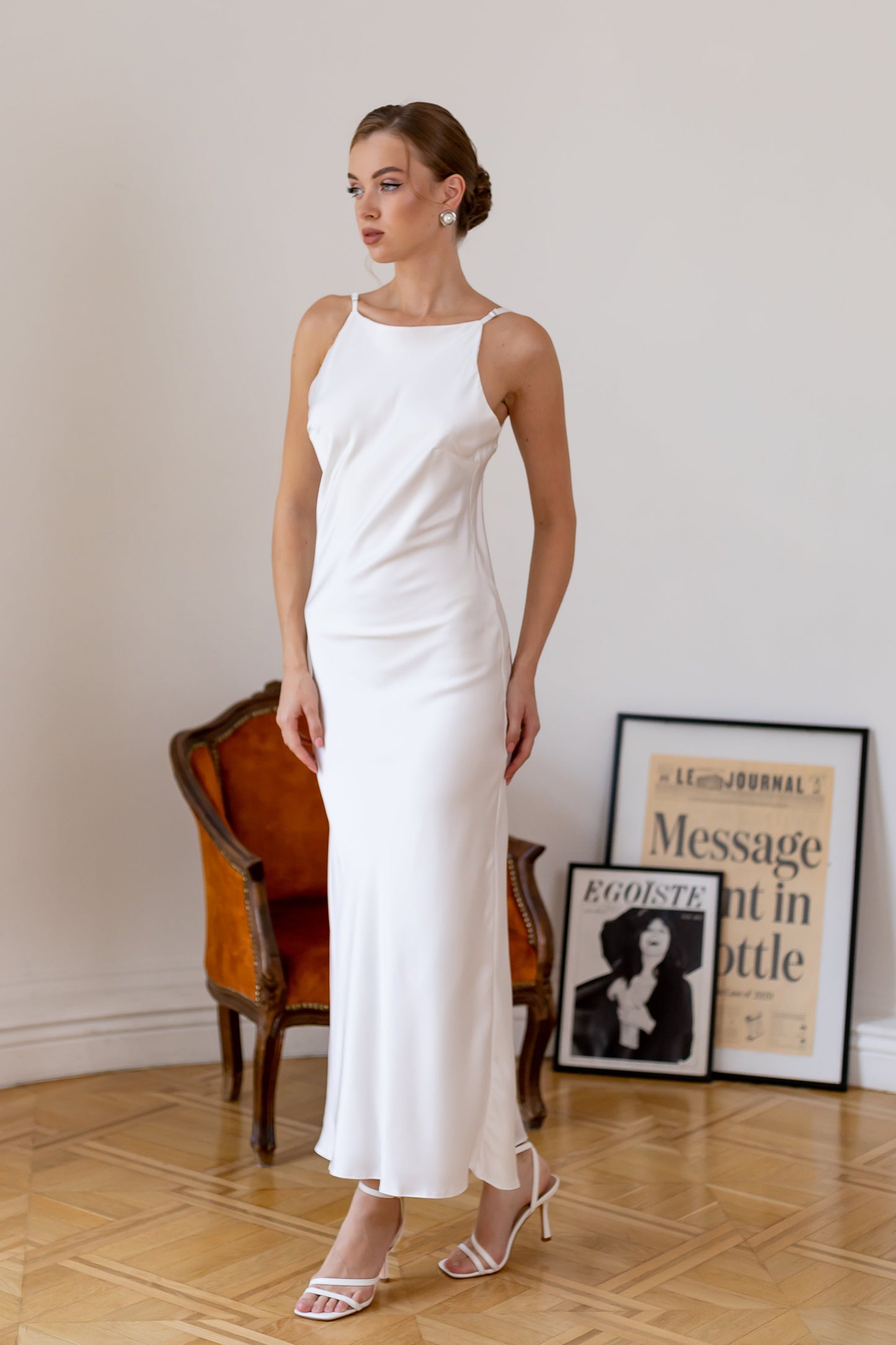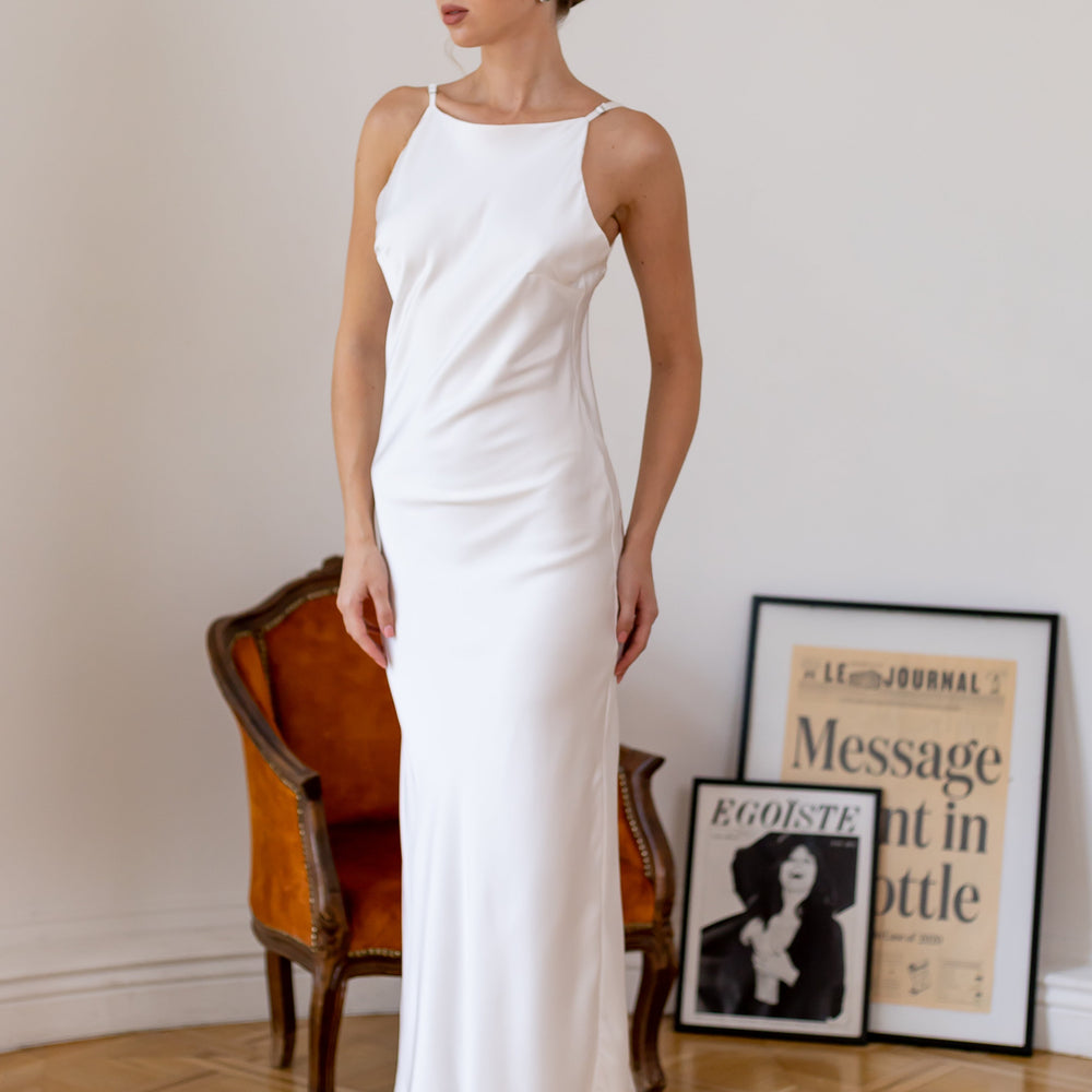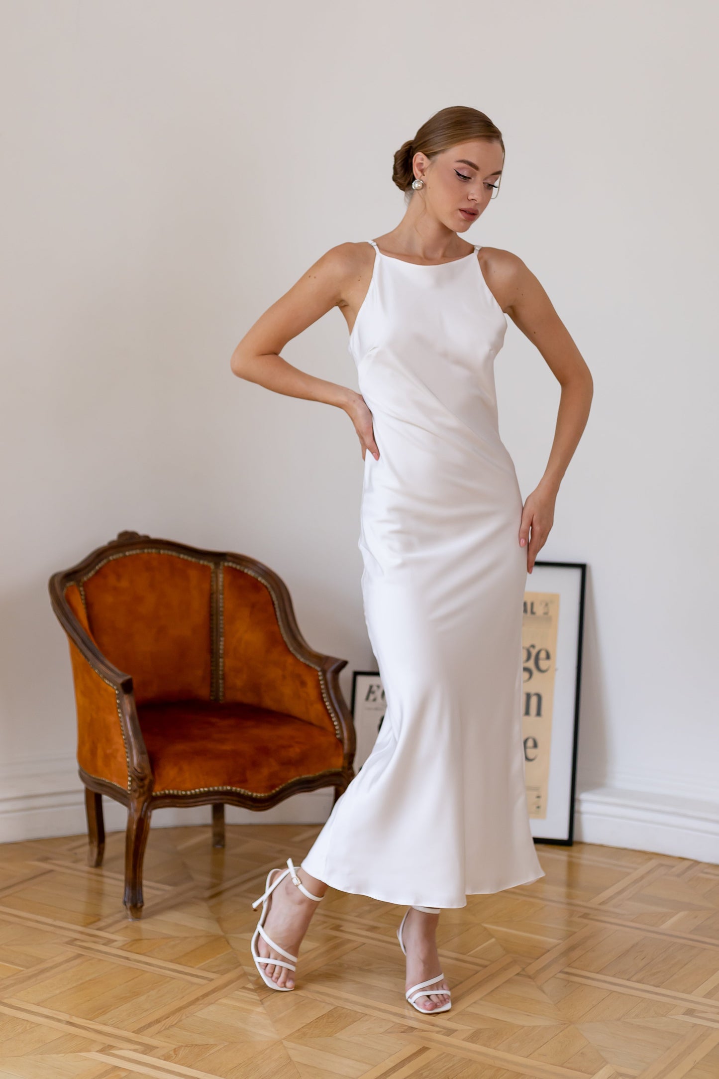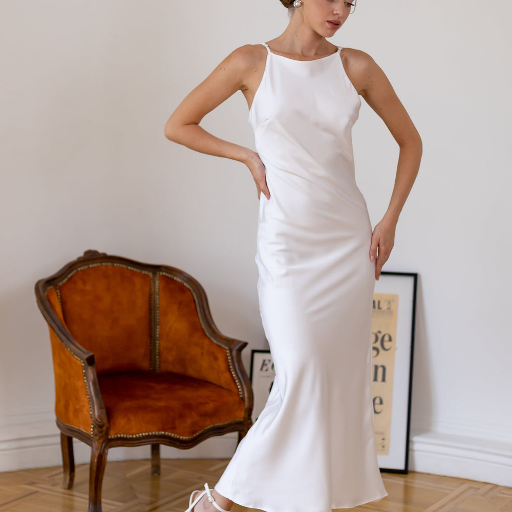 The open back dress detail adds a touch of unexpected drama to this silk gown, revealing just the right amount of skin to create a memorable impression. Whether it's for a romantic beach wedding or a grand ballroom affair, this ivory silk dress is sure to make any bride feel like a timeless beauty on her special day